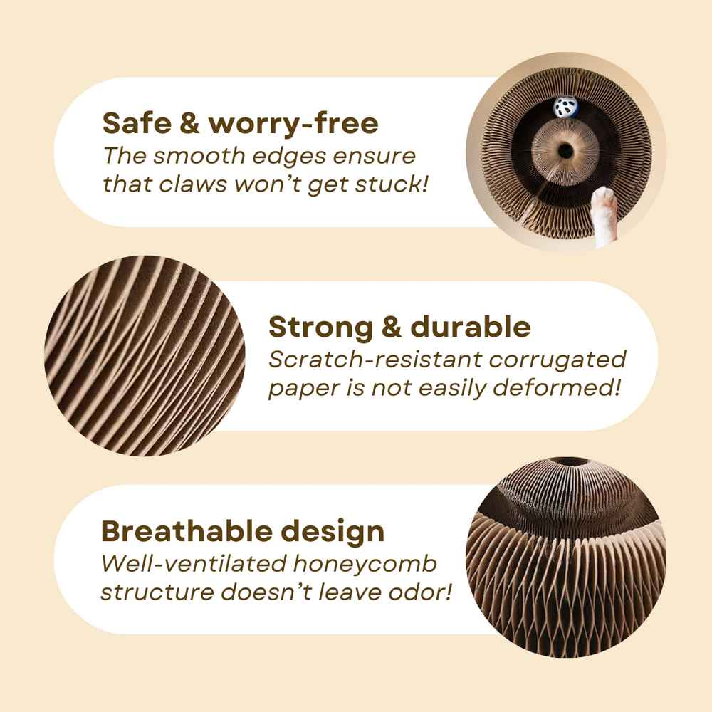 - Multifunctional Cat Scratching Board- Magic Organ Cat Scratcher offers an ideal shape to play and scratch, suitable for cats of all ages! No cat can resist it, two in one for claw grinding and playing.It can be folded into a bone shape, folded into a crib to sleep in,or scratched at will to make cats love claws.